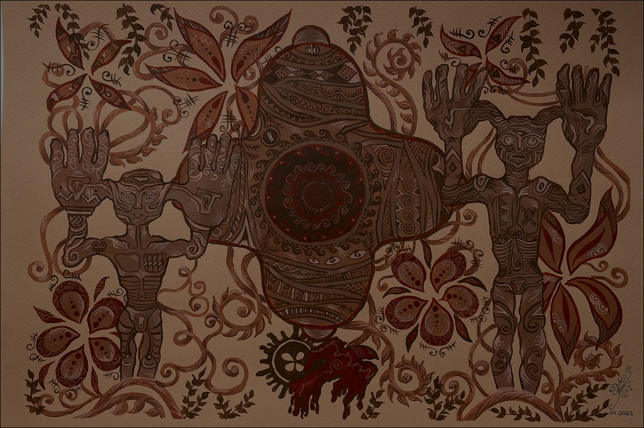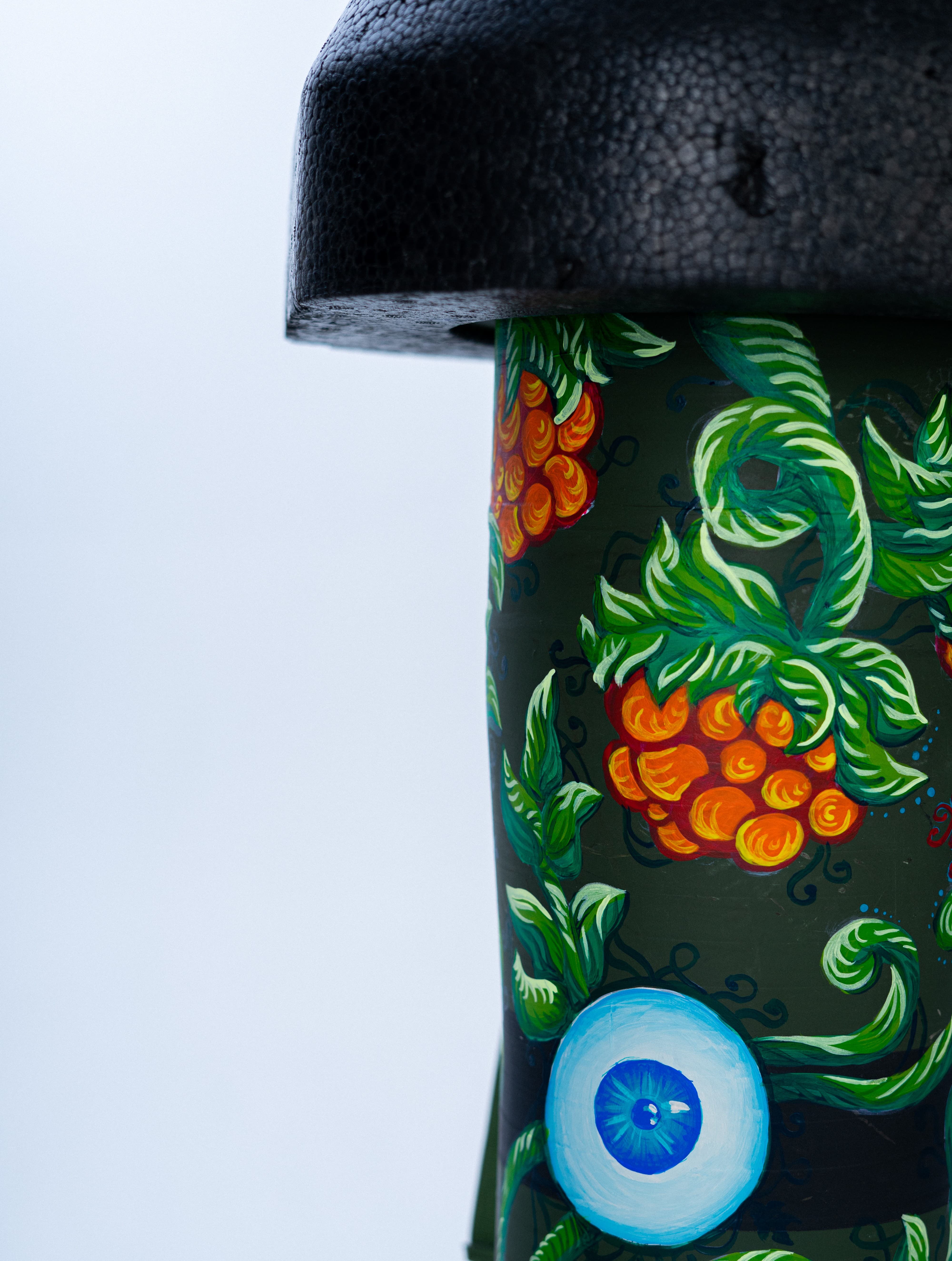 The burrs symbolize human flaws and vices — the inner obstacles we must overcome in order to build a better world. All elements are interconnected: our actions and their consequences, our labor and its outcome. This connection is visually expressed through entwined vines painted across the object — a metaphor for the invisible threads that bind cause and effect, self and society, destruction and rebirth.