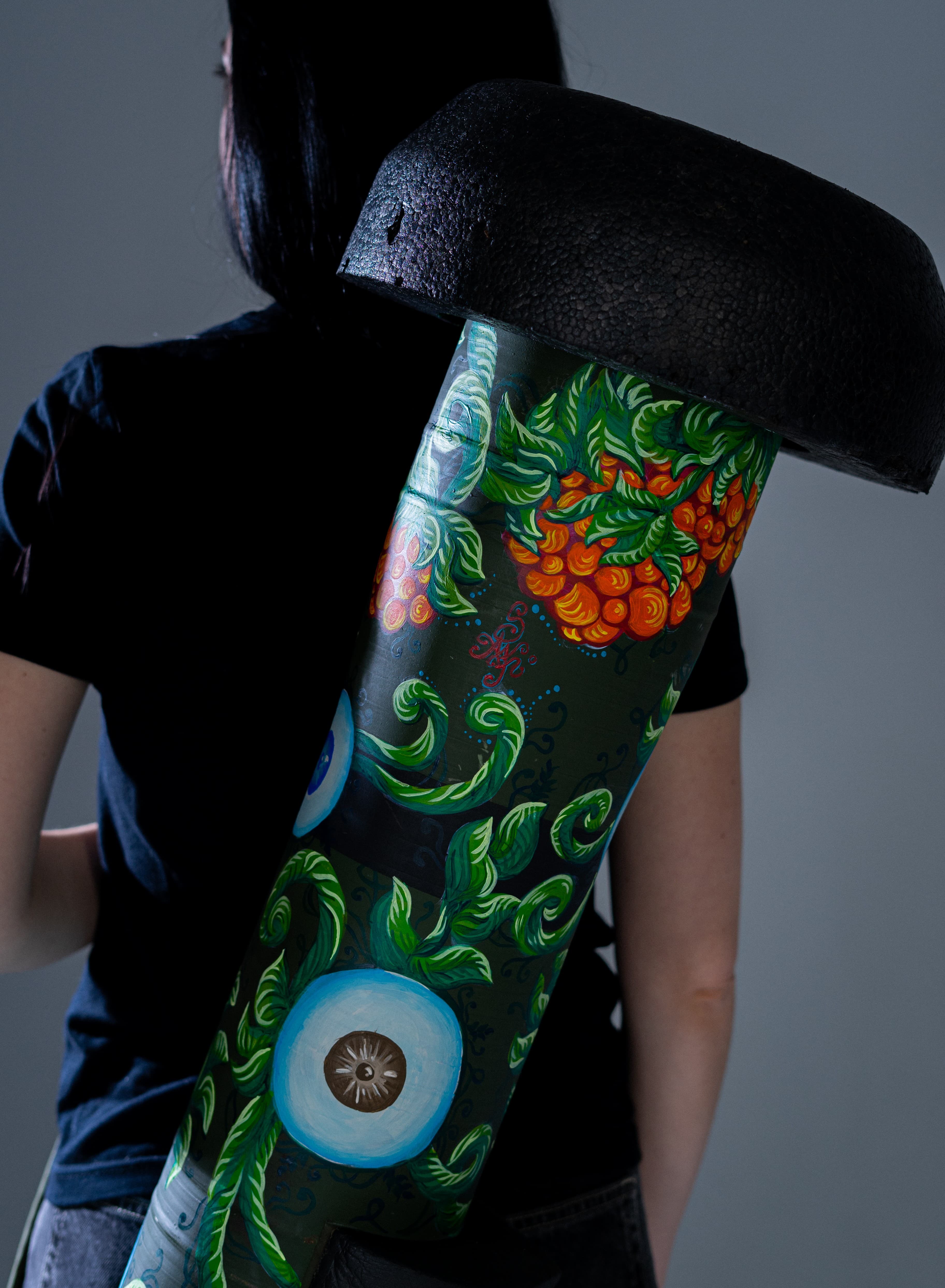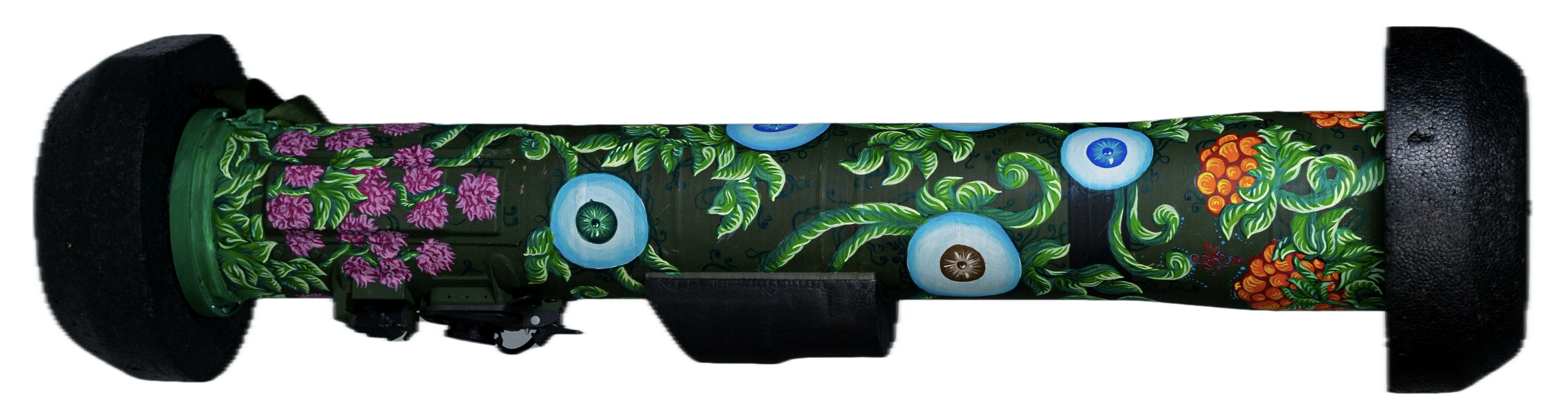 A transformed Javelin — turned into an art object after being used on the battlefield. Created for an auction at the House of Cinema in Kyiv, Ukraine. The piece is rich with symbolism. The eyes represent the idea that the universe — and justice — sees all. Nothing goes unnoticed, and everyone will ultimately receive what they deserve. The viburnum (kalyna) is a powerful Ukrainian symbol of national identity and deep-rooted heritage. It speaks to our cultural consciousness and connection to the land.