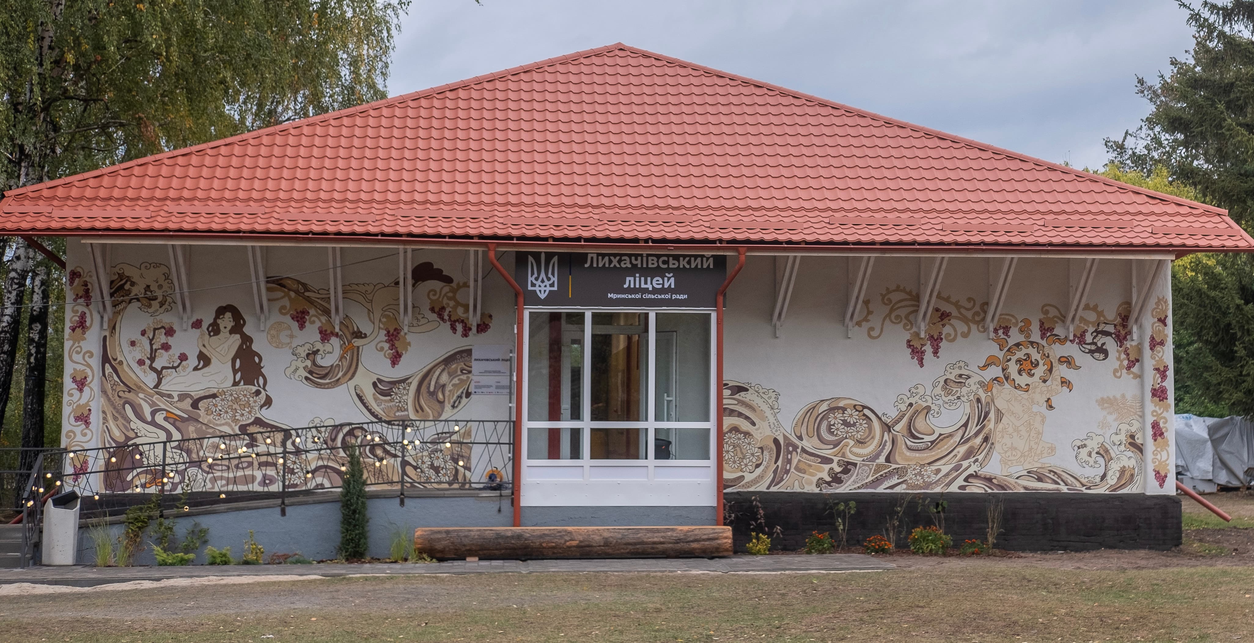 The lyceum in Likhachiv village. Ukraine. At the beginning of the war in 2022, this lyceum was damaged by shelling. Therefore, Brave to Rebuild Foundation and the European Commission decided to restore it. And not just restore it, but create an art installation. They invited me as an artist to create a mural on the facade of the school.The school itself was built nearly 100 years ago, in 1927, using an ancient Ukrainian technology of clay houses.