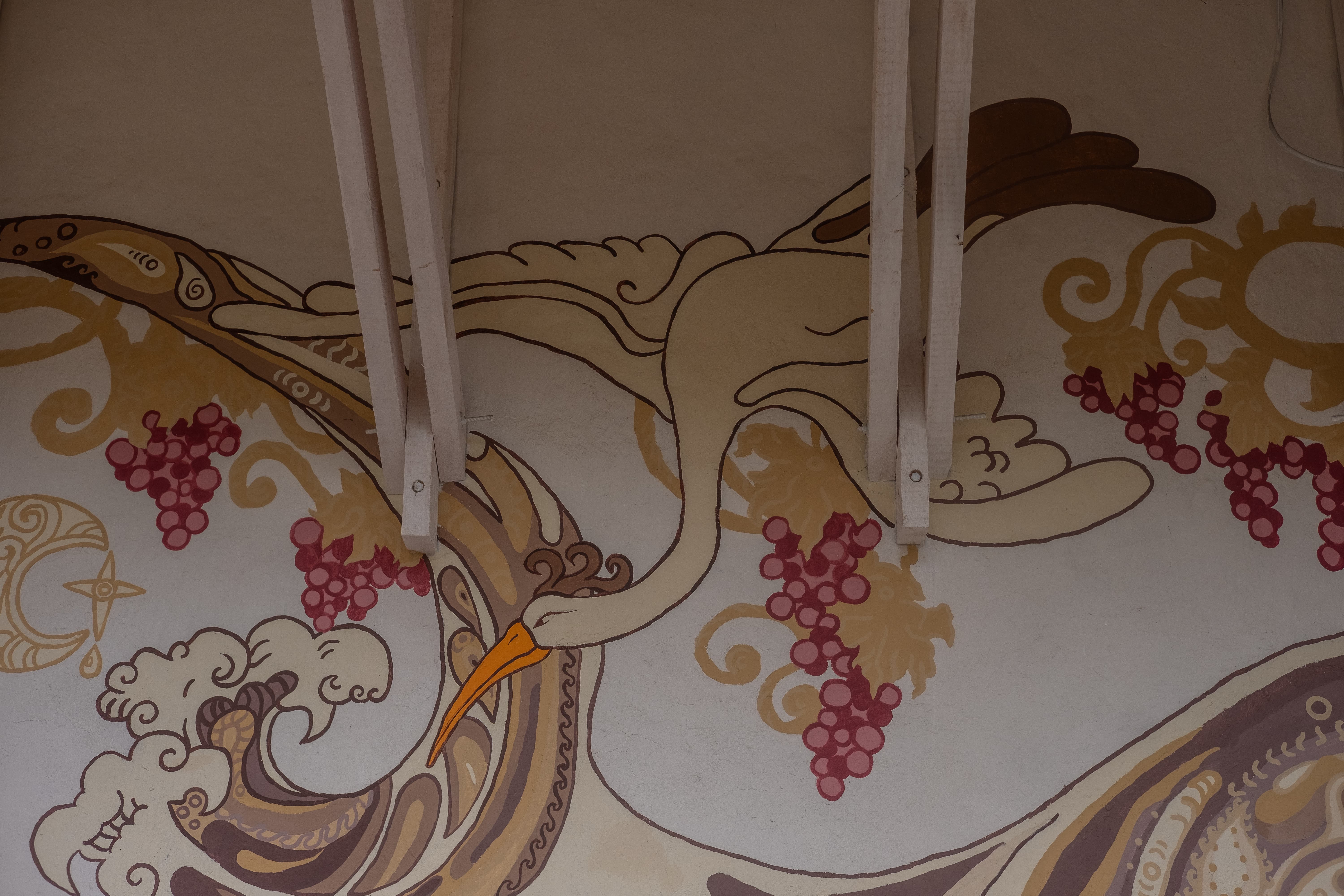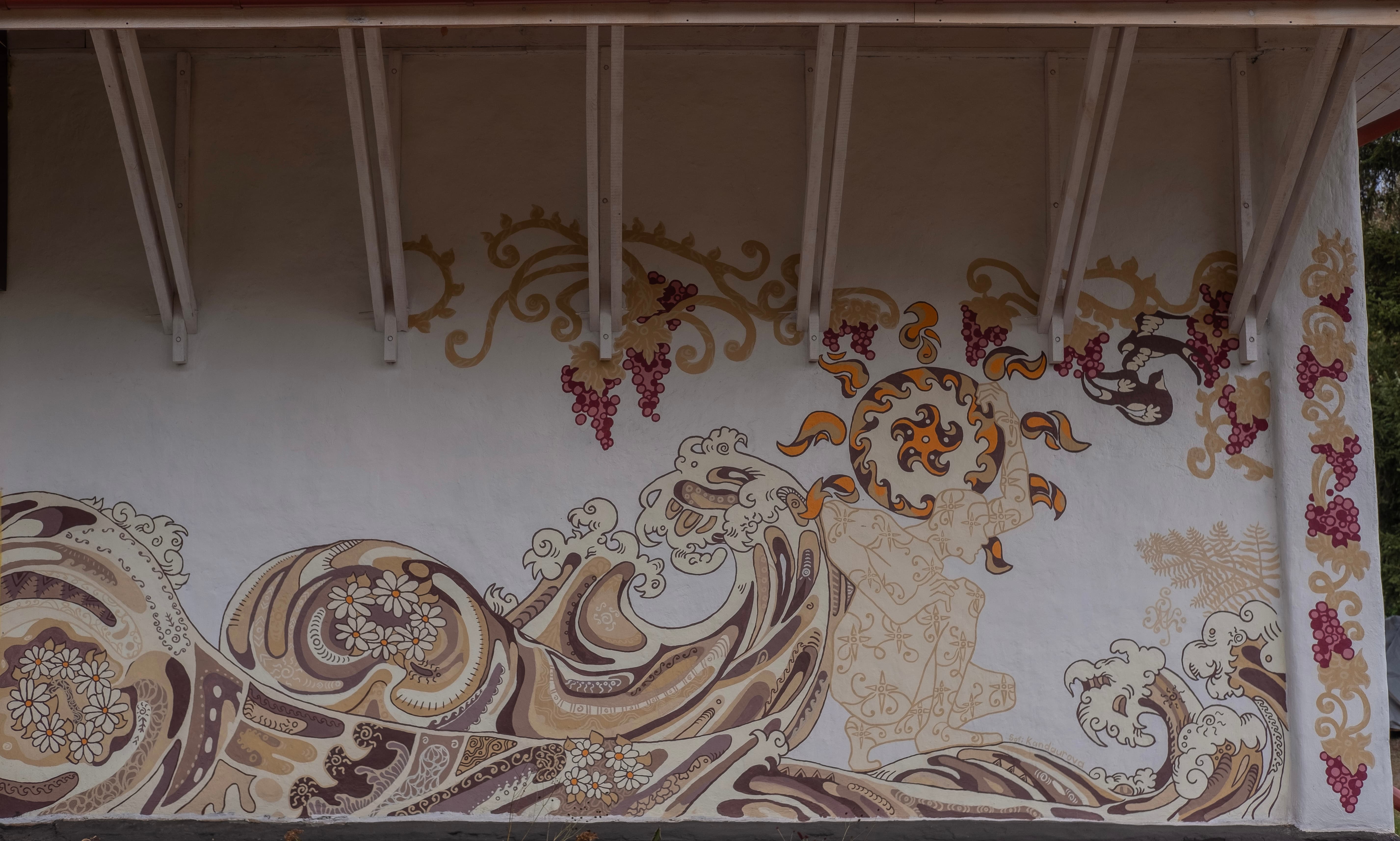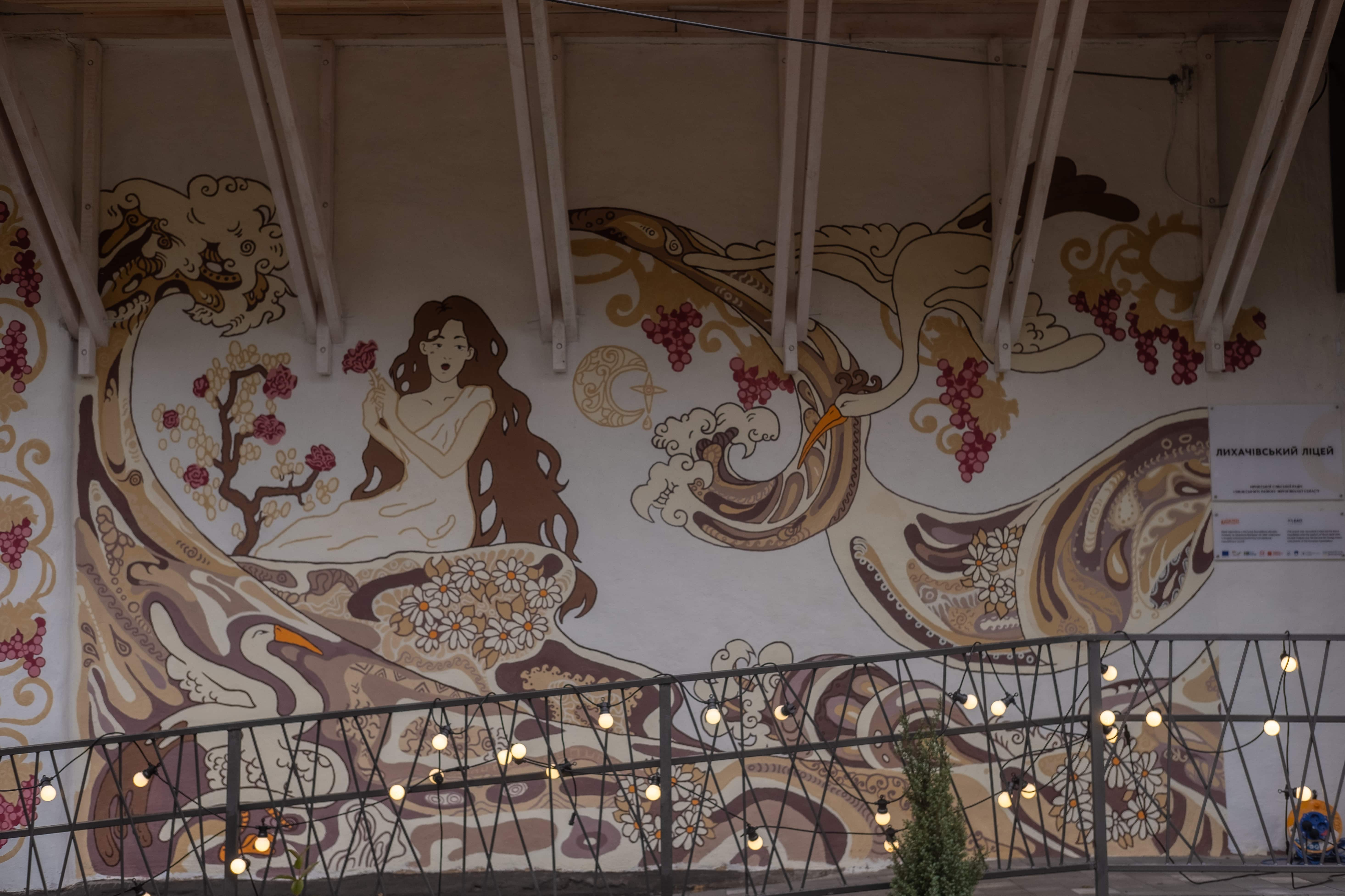 It was restored using the same technique. More than 70 volunteers from the “Brave to Rebuild” community and local residents worked together to ensure that the school could reopen its doors. In this mural, I combined traditional Ukrainian painting with a story from the present. The grapevines are also a traditional ornament for this area. She is waiting. And she sends the wreaths on the water, hoping to find her beloved. The strong waves of life rise above her head, but the most important thing for her is inner peace.
